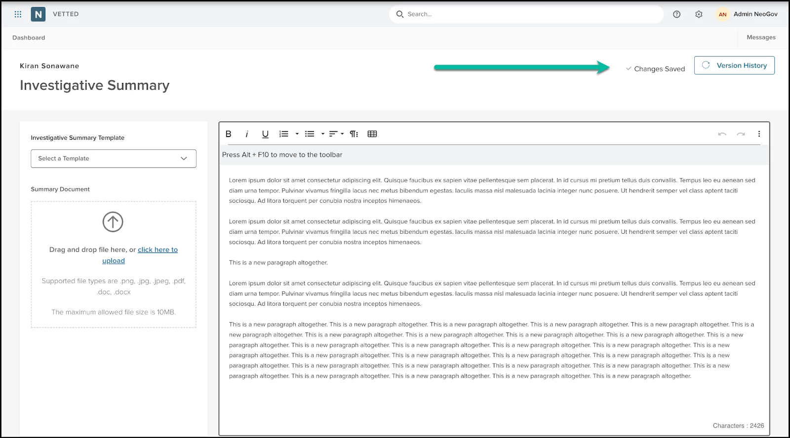 With this release, the Investigator Summary auto-saves your work as you type and gives you access to a detailed version history complete with timestamps, editor names, and the ability to restore to a prior version.