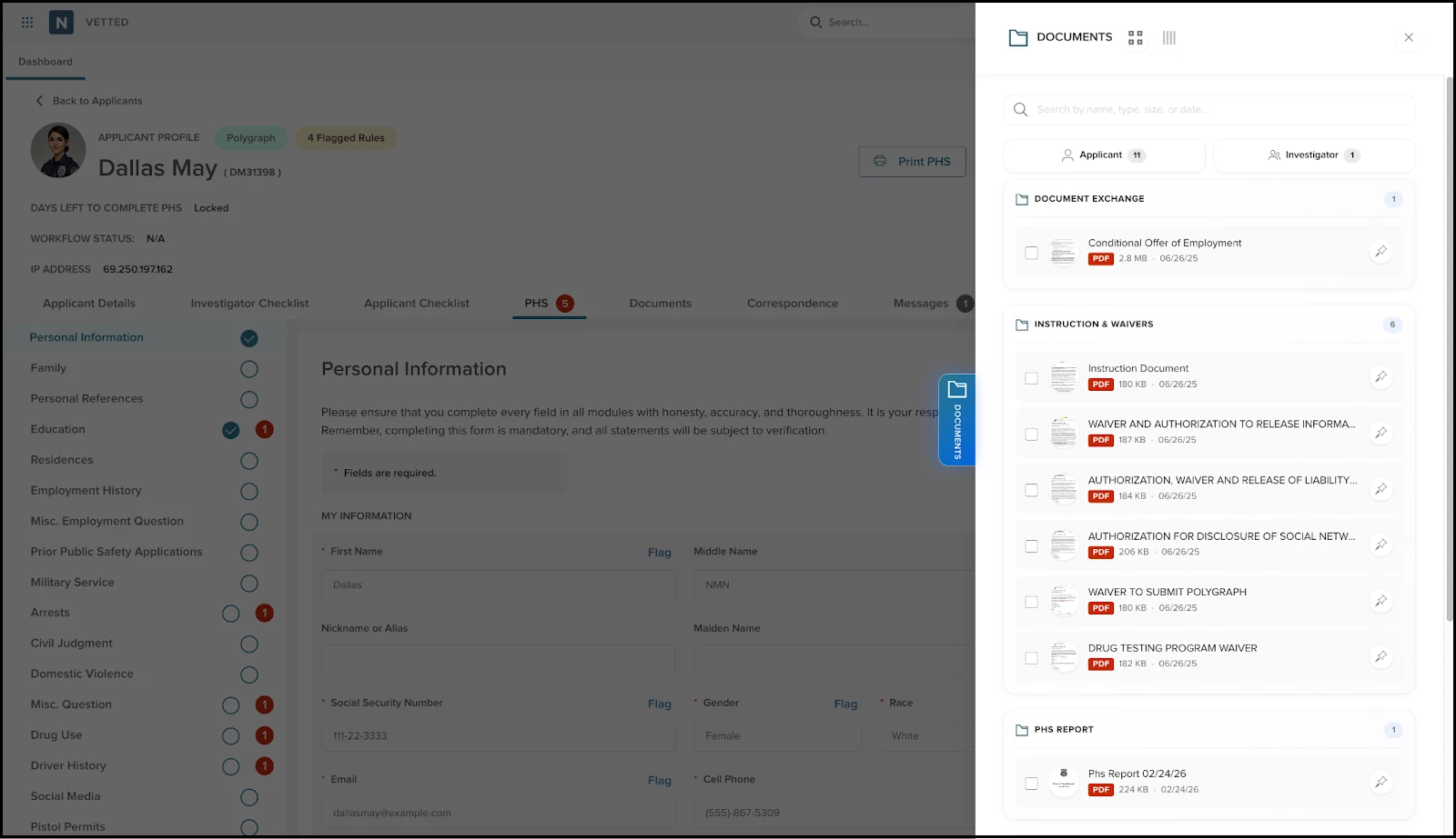 - The "Hide" Power-Move: While reviewing the Arrests module of the PHS, an investigator opens the DocuViewer to compare the uploaded arrest report with the applicant's arrest report. They use the Hide button to quickly toggle document view on and off to verify specific dates against the PHS fields.
