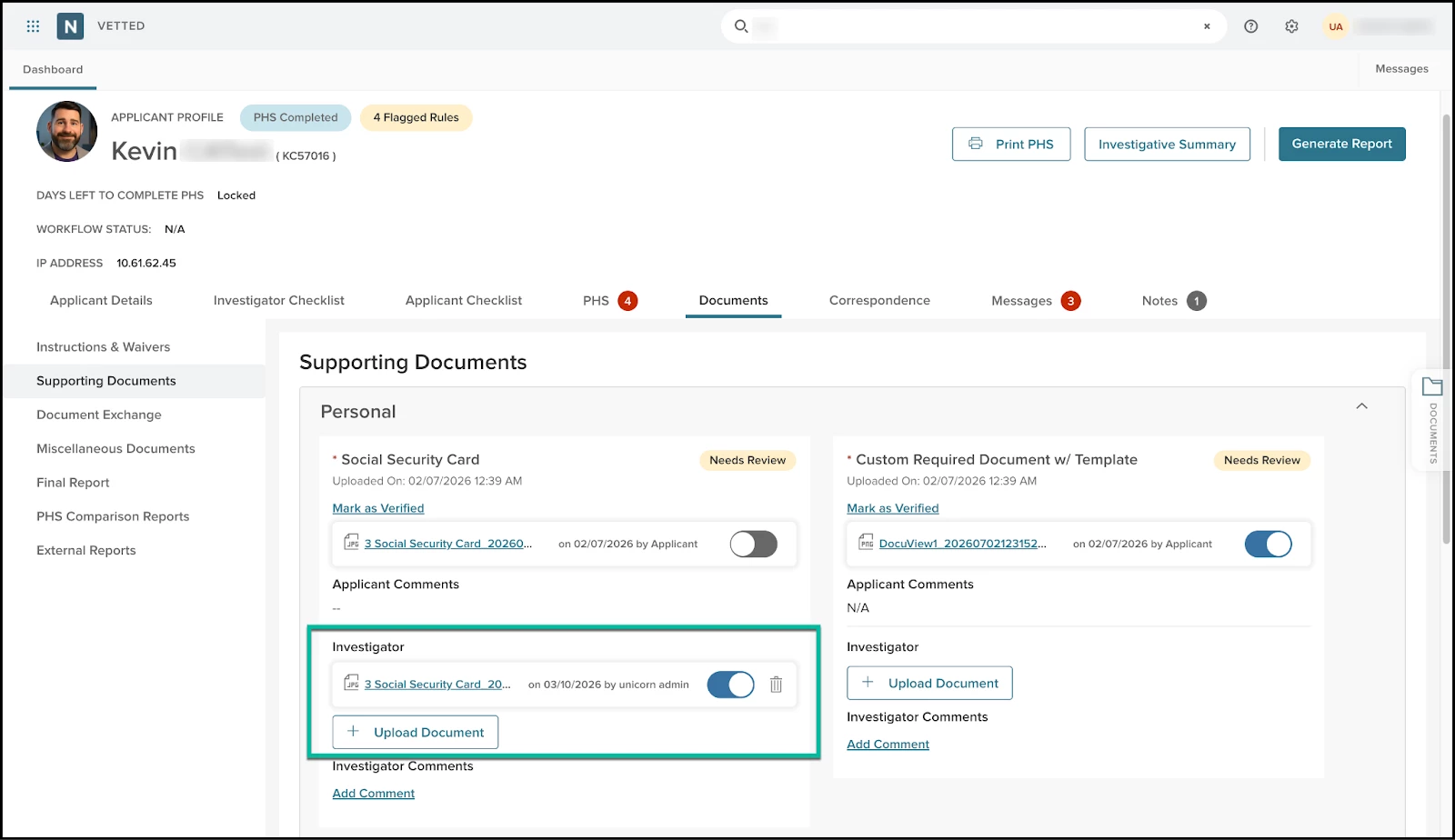 When viewing the Supporting Documents tab within an Applicant File, users with appropriate permissions will now see an upload button within each document card. This allows you to fulfill a requirement on the applicant's behalf, ensuring that the background file is complete and ready for review without waiting for the applicant to log back in. And when generating the Final Report, users now have the ability to select exactly which version of a document (the Applicant's or the Investigator's) should be included by enabling or disabling the document.