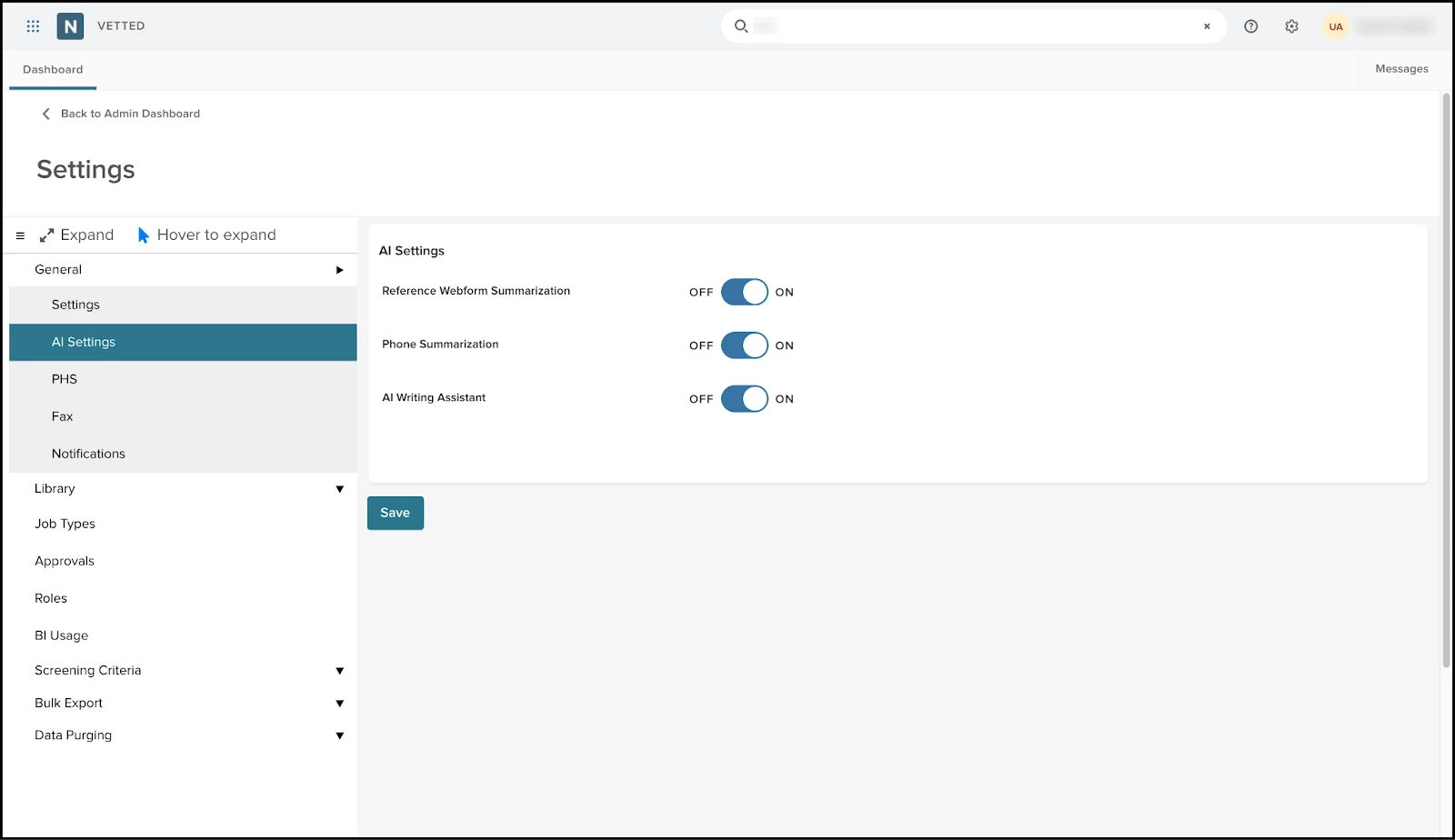 With this release, Admins now have a centralized location within Settings to independently enable or disable specific AI-powered features. This "opt-in" approach ensures that Vetted aligns perfectly with your agency's internal policies, compliance requirements, and risk management standards.