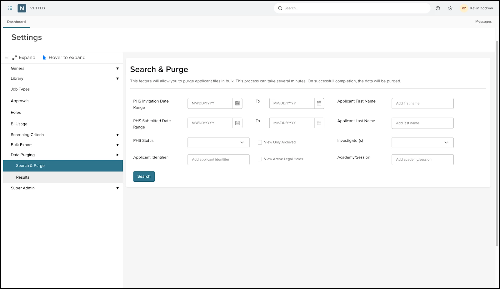 Admins can also search for and permanently delete applicant records using custom filters such as PHS status, submission date, investigator, or academy session. The purge process includes built-in validation, confirmation steps, legal disclaimers, and a downloadable audit report.