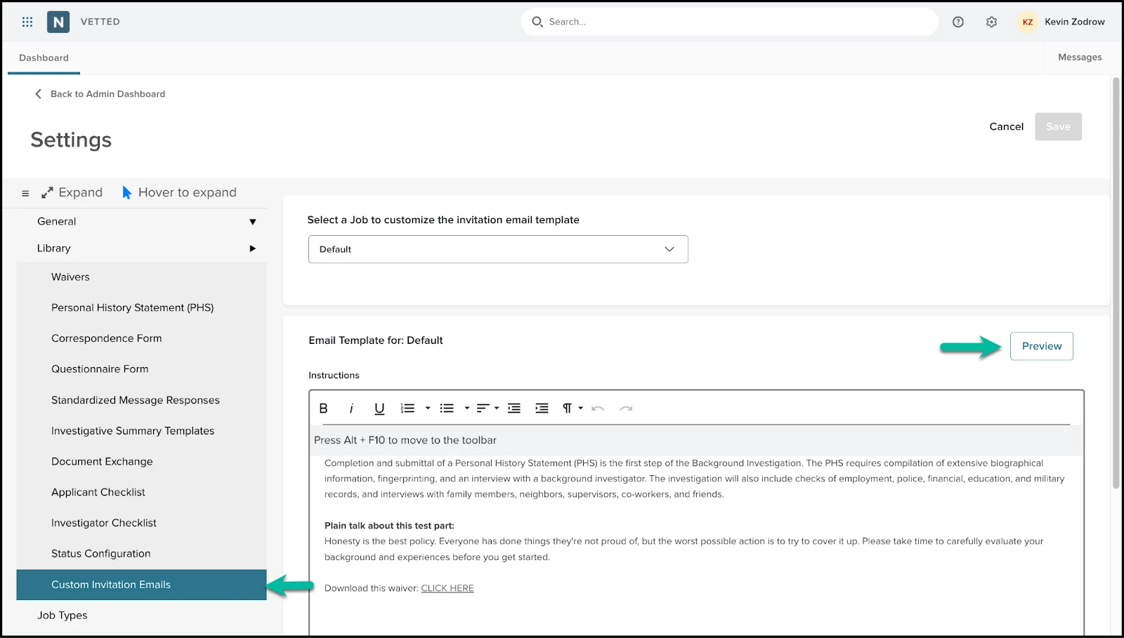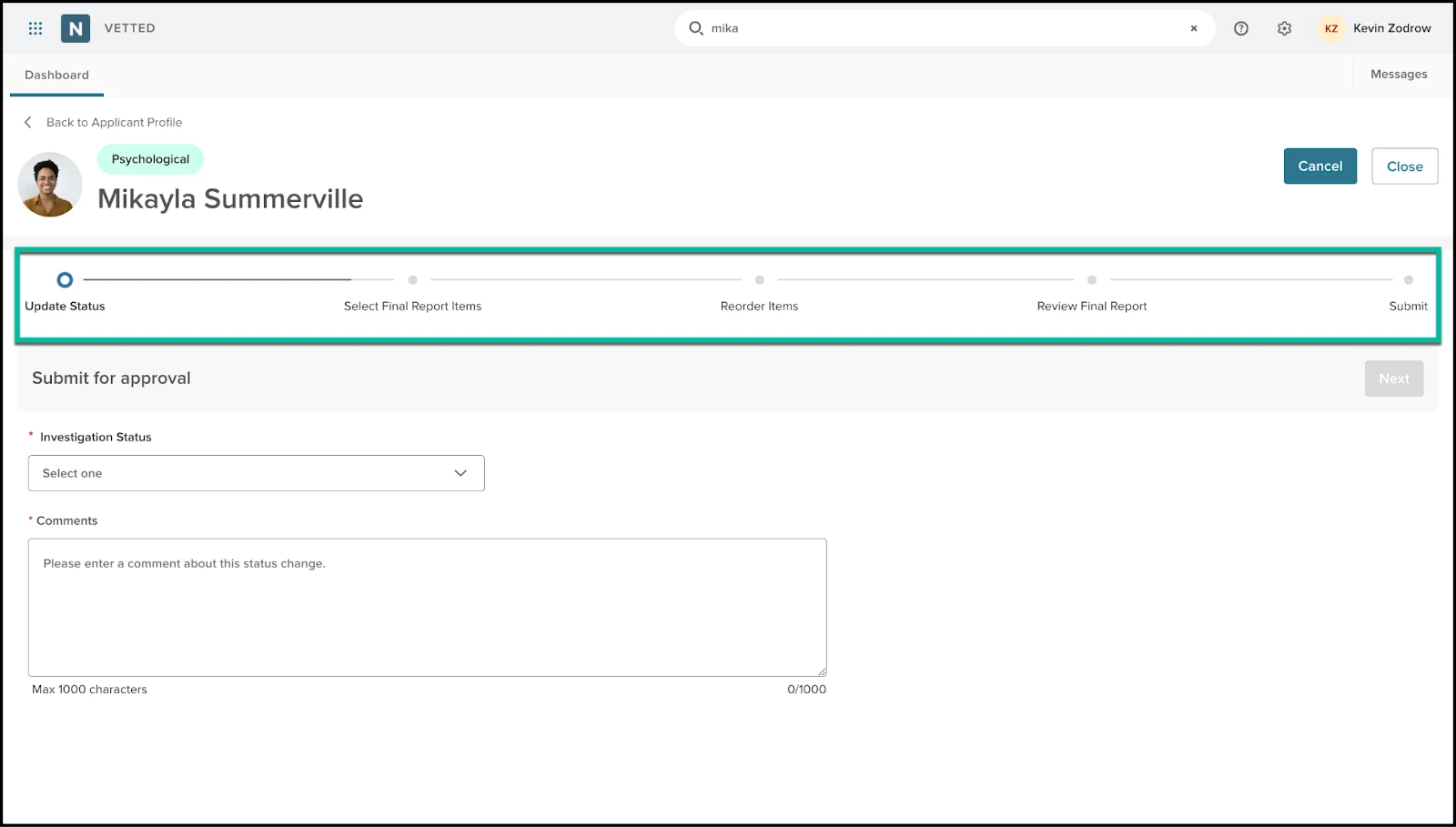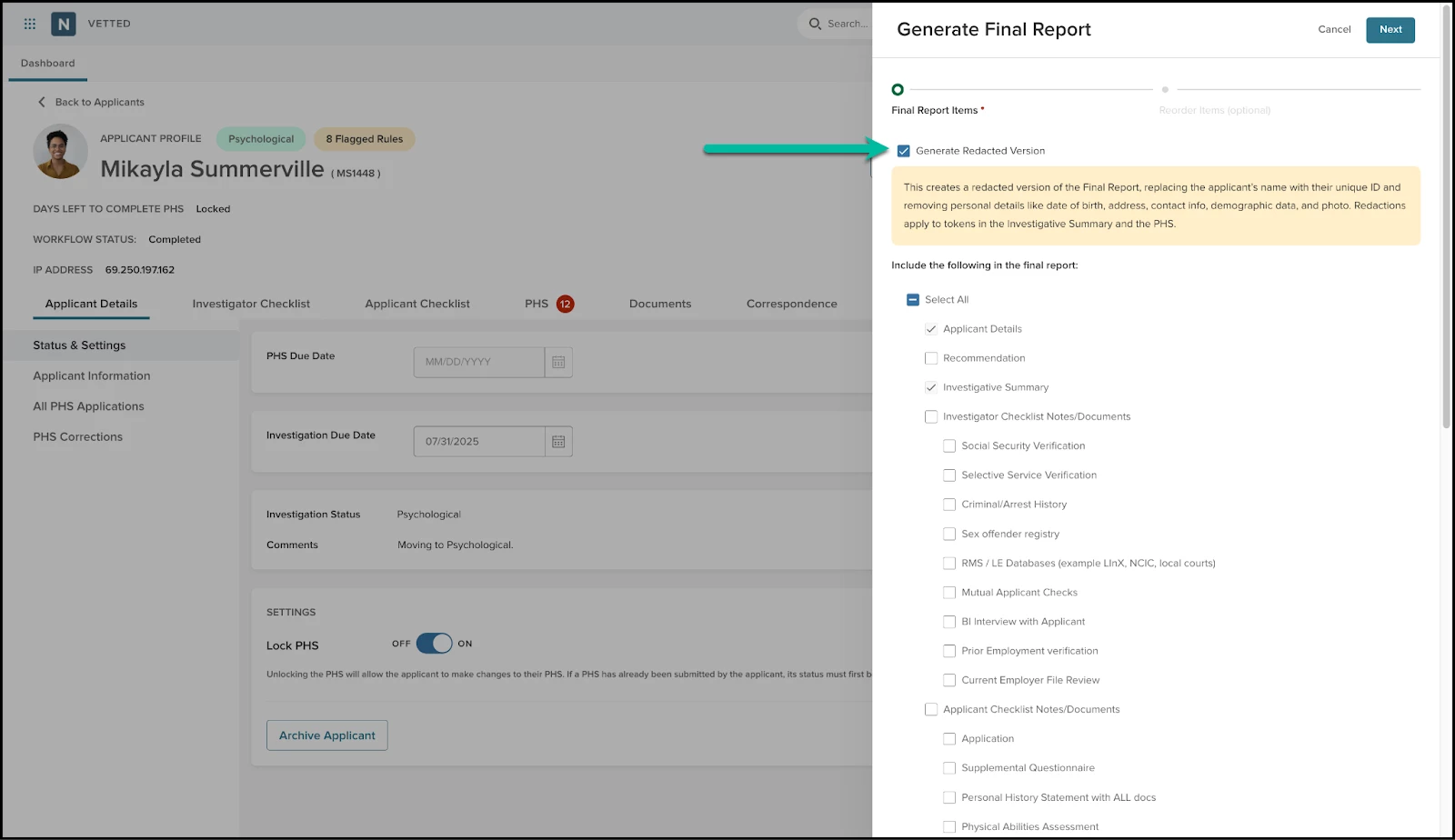 Bias-free review is now easier. With this release, Admins and Investigators can generate a redacted version of the Final Report. This version replaces applicant-identifying information with a Vetted-generated unique ID and removes sensitive personal data, including the Personal History Statement (PHS).