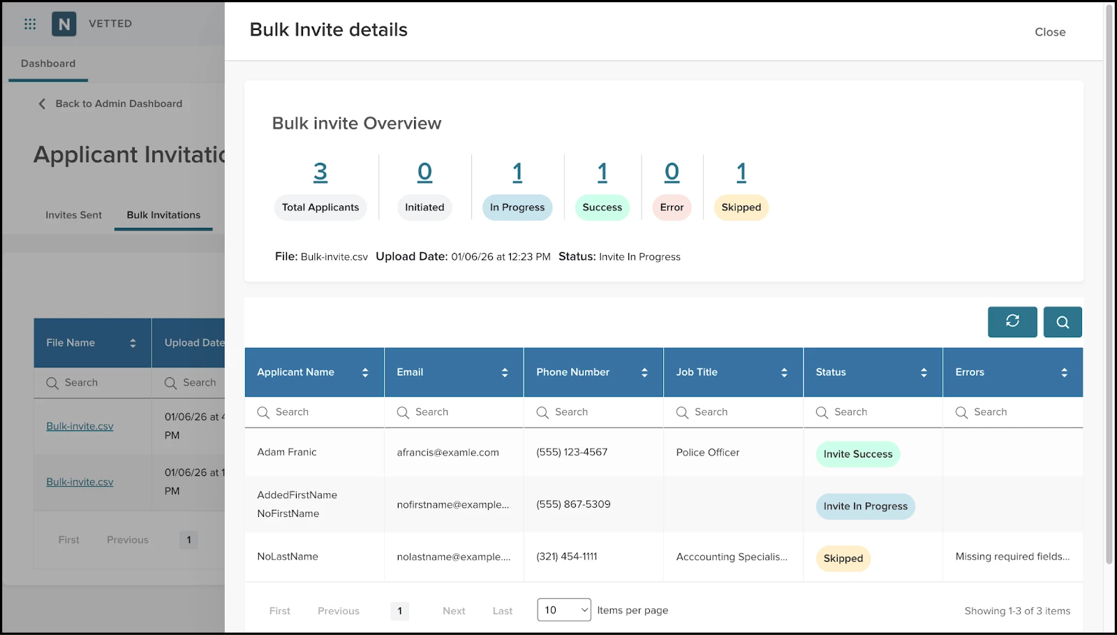 - An Admin uploads 150 applicants. Twelve rows contain errors—10 are fixed in Vetted, two are skipped, and the rest are invited successfully.